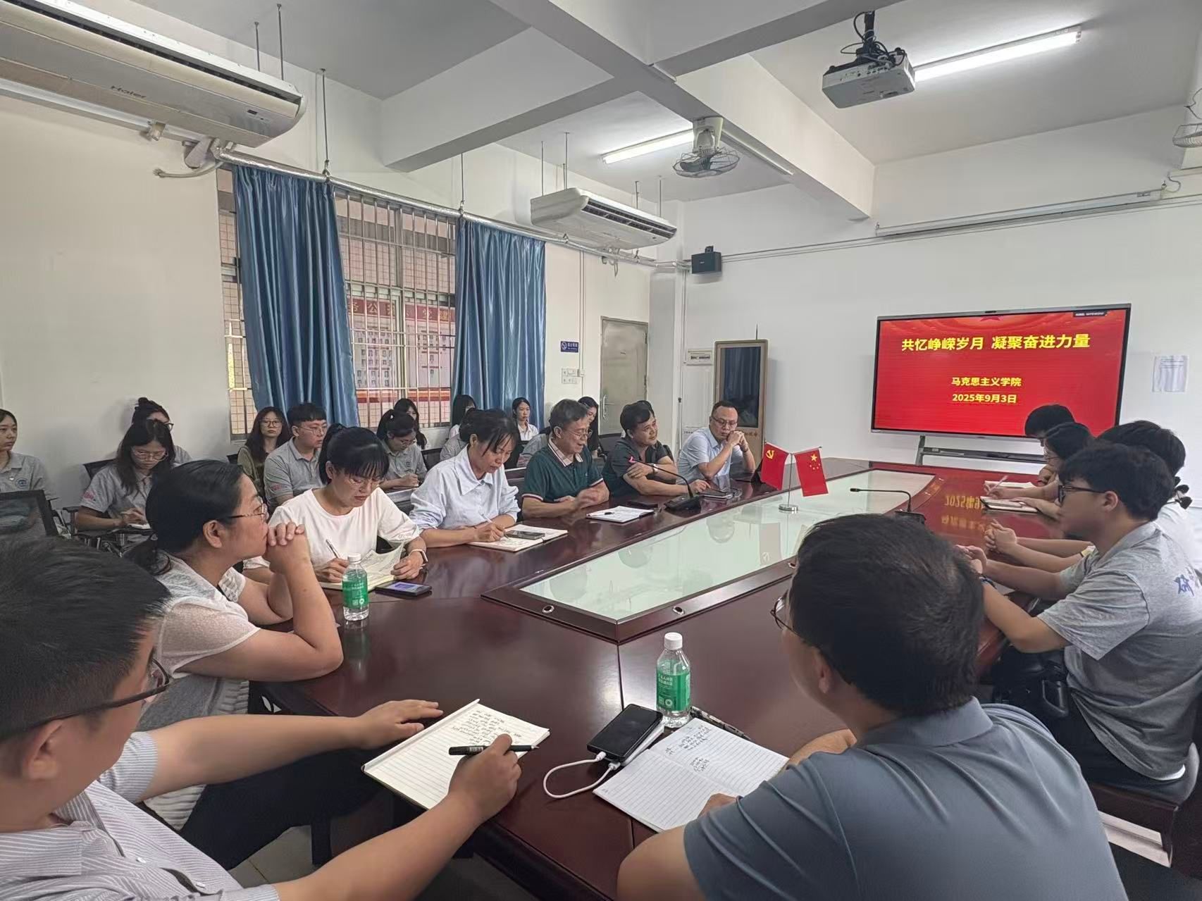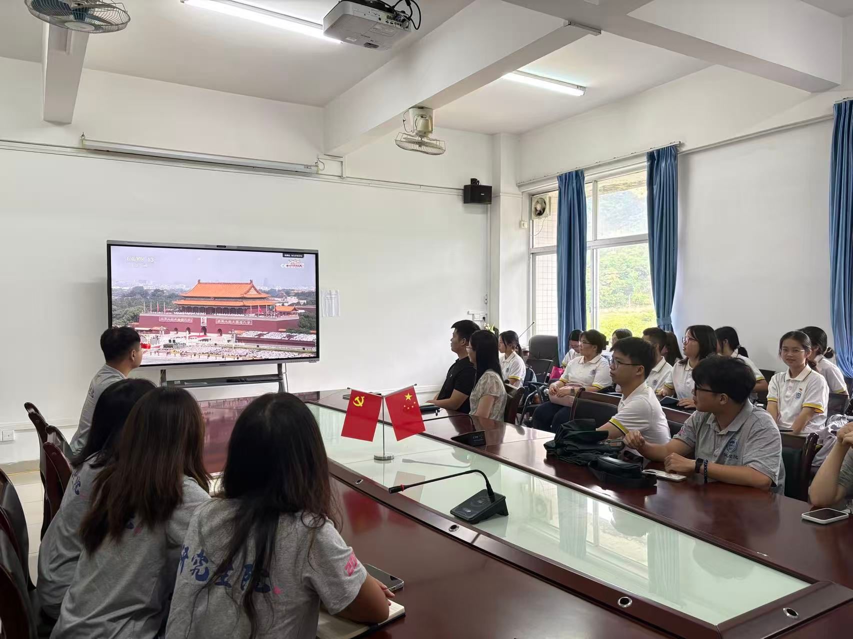 上午8时50分许,学院会议室早已座无虚席,师生代表们怀着崇敬与期待的心情提前到场,整齐就座等候直播开始。随着直播信号准时切入,全场师生齐声高唱中华人民共和国国歌,聆听习近平总书记激动人心的重要讲话,当威武的受阅部队迈着铿锵有力的步伐通过检阅台,当先进的武器装备依次亮相展现大国实力,现场师生无不被这震撼人心的画面所感染,不时响起热烈的掌声。大家聚精会神共襄盛典,眼神中饱含对革命先烈的缅怀、对国家强盛的自豪,深刻感受到中国人民在抗日战争中浴血奋战、不屈不挠的英雄气概,以及如今祖国日益强大带来的安全感与使命感。