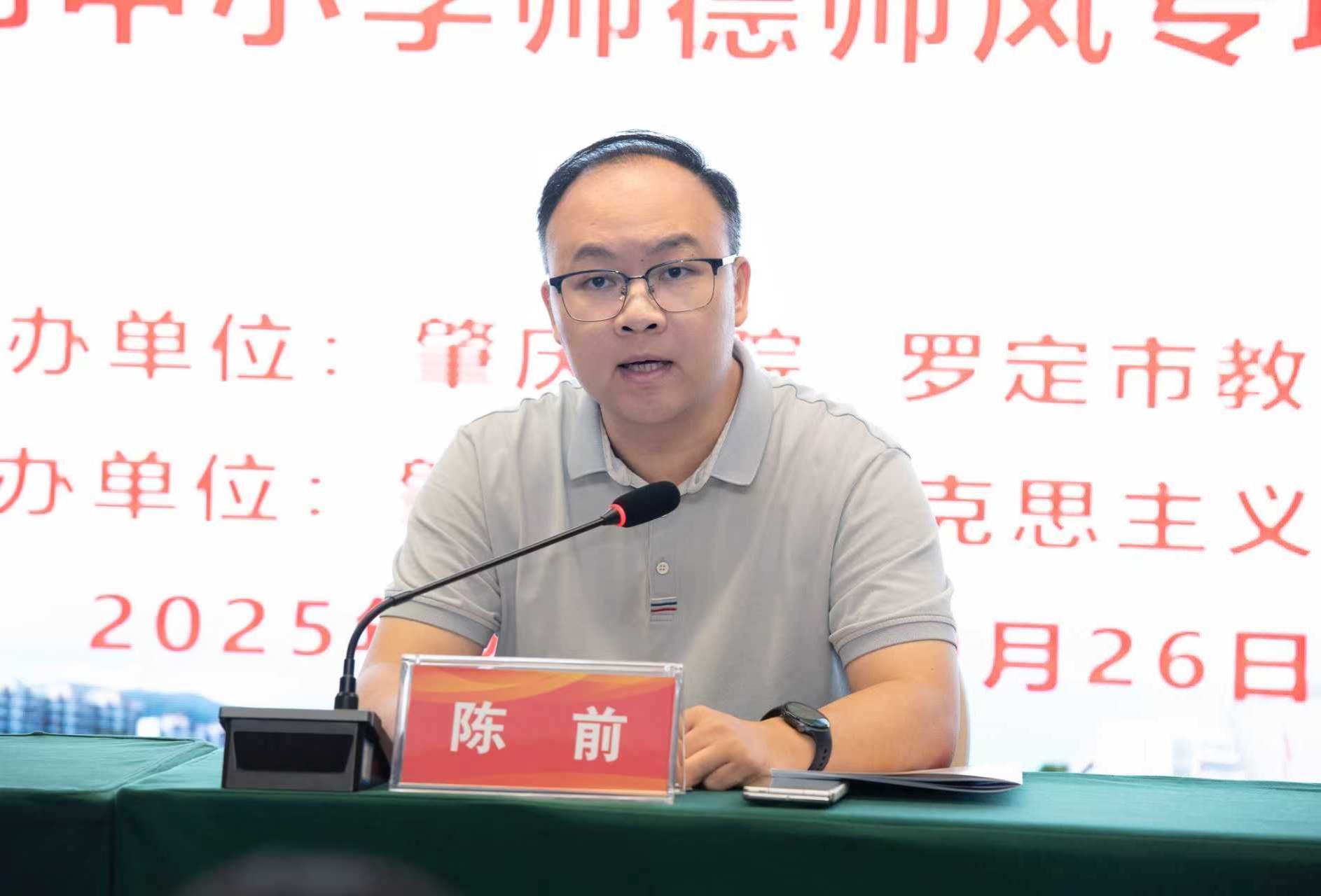 陈前在讲话中指出,党的十八大以来,习近平总书记始终心系教师队伍建设,多次强调“要把师德师风建设摆在首要位置”,勉励广大教师努力做塑造学生品格、品行、品味的“大先生”。本次培训既是推动罗定基础教育高质量发展的一项具体行动,也是进一步贯彻落实上级决策部署的重要举措。他强调,教师要做到“三要”,一是要筑牢信仰之基,成为立德树人的示范者;二是要涵养高尚师德,成为教育家精神的践行者;三是要提升专业技能,成为教育高质量发展的推动者。英国365集团和罗定的参训教师要全面贯彻落实习近平总书记关于师德师风的重要指示精神,精心组织和积极参与培训课程学习,通过集中学习与思考,以问题为导向,以实践研学为依托,不断提升师德师风水平,赋能“三所学校”帮扶工作取得成效。