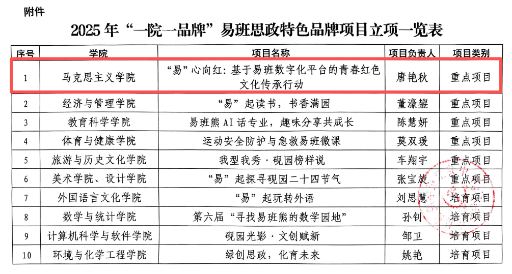 在2025年学校“一院一品牌”易班思政特色品牌项目评选中,唐艳秋老师负责的《“易”心向红:基于易班数学化平台的青春红色文化传承行动》成功获批重点项目立项。该项目以易班平台为载体,将思政教育与网络育人场景深度融合,是学院探索思政育人新形式的具体实践,将为学院的思政品牌建设提供可借鉴的特色路径。