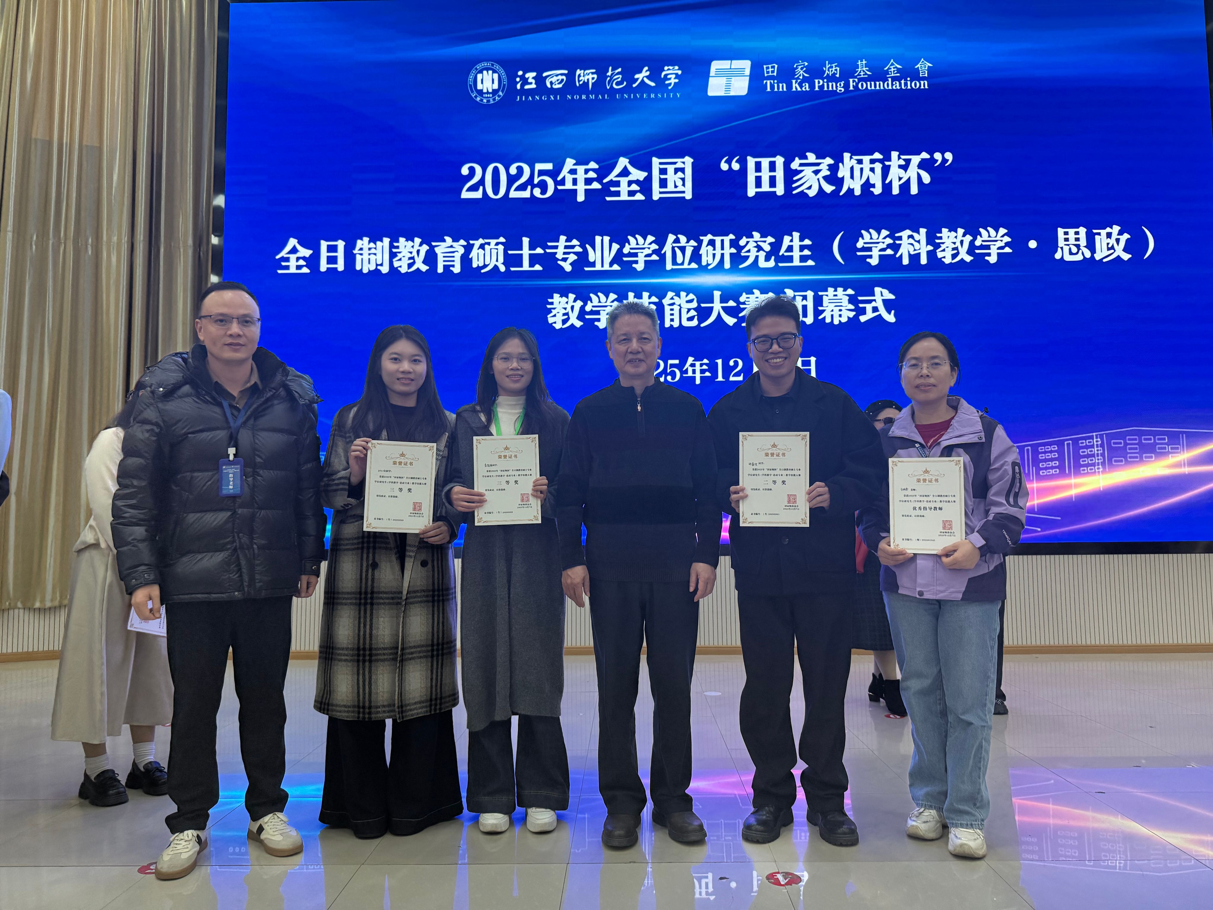 本网讯 2025年12月5日至7日,由江西师范大学主办的2025年全国“田家炳杯”全日制教育硕士专业学位研究生(学科教学·思政)教学技能大赛在南昌圆满落幕。我院入围国赛的三名研究生全部获得等次奖,其中,2023级胡嘉俊荣获二等奖,2023级刘小渝、2024级袁俊楠分别荣获三等奖,方拥香老师荣获优秀指导教师。
