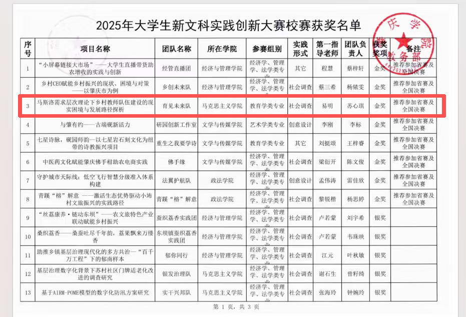 此前,24级思政2班苏心琪同学作为项目负责人,连同项目成员梁柏源、曾思齐、周丽梅、谭智浩等思政专业的同学,在学院专业老师易明的指导下,组成项目团队,积极参与校内新文科实践创新大赛赛事。团队成员在指导老师的精心教导下,凭借对专业知识的深入理解与创新思考,历经层层比拼,在80个项目中脱颖而出,以《马斯洛需求层次理论下乡村教师队伍建设的现实困境与发展路径探析——以广东省罗定市为例》为研究项目最终斩获校内新文科大赛金奖,并代表学校出征省赛。